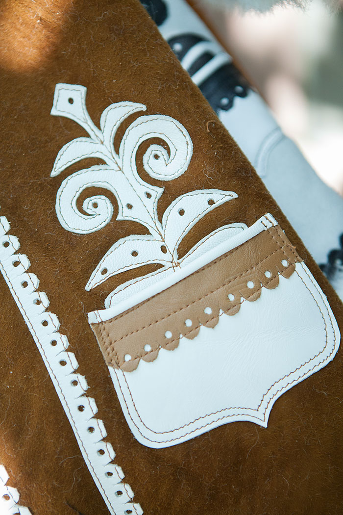 Constantin Cojan şi un ornament de pe bundiţa confecționată de el. Toate fotografiile din acest articol sunt făcute de Roman Friptuleac.