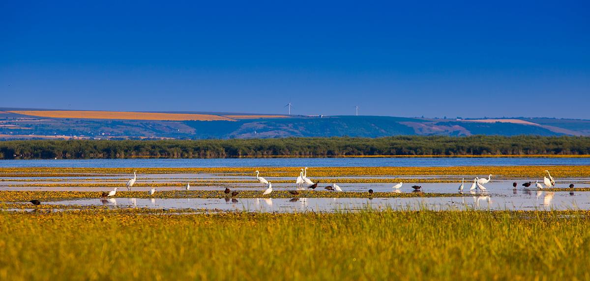 Egrete mari (păsările albe mari), egrete mici (păsările albe mici), țigănuși (negri roșcați), și un stârc cenușiu (al doilea din dreapta, cu gâtul înstins), pe lacul Beleu. Fotografie de Roman Friptuleac