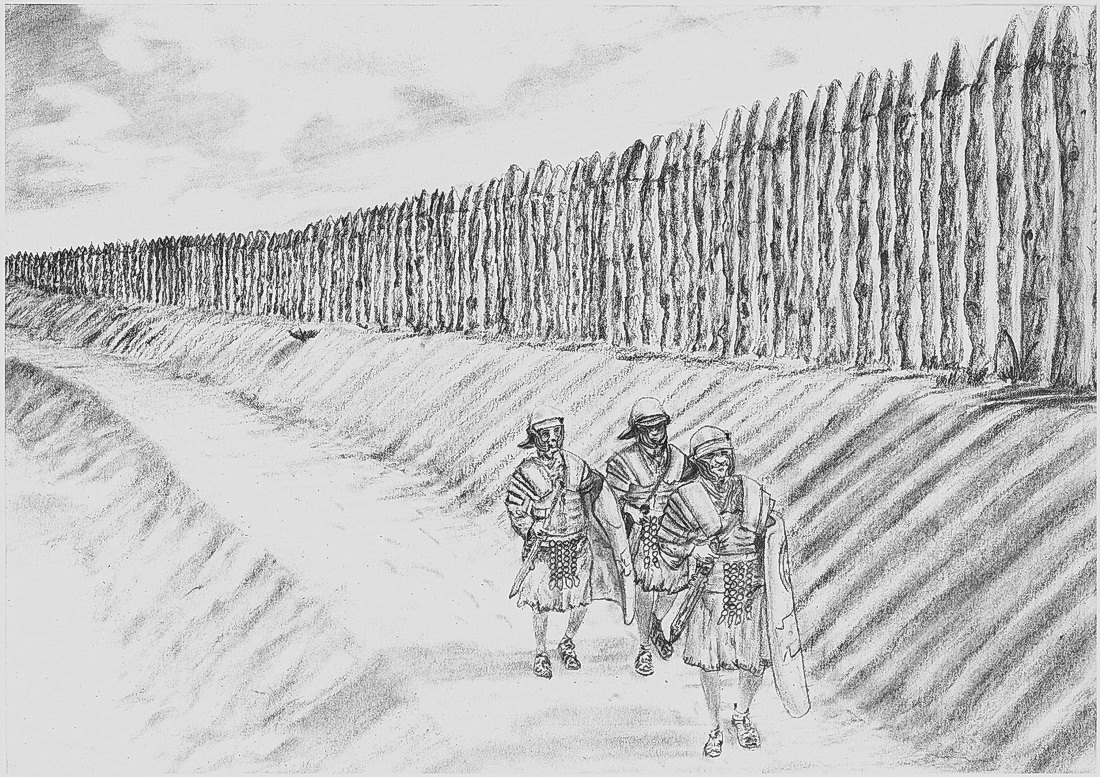 Valul lui Traian de Jos de lângă Vadul-lui-Isac. Valul se presupune că avea deasupra o palisadă (fortificație formată din pari înfipți în pământ), alături un șanț, precum și o suprafață plată între val și șanț, denumită „bermă”. Reconstituire grafică făcută pentru proiectul nostru de Claudiu Călin, pe baza informațiilor oferite de arheologul Sergiu Popovici.