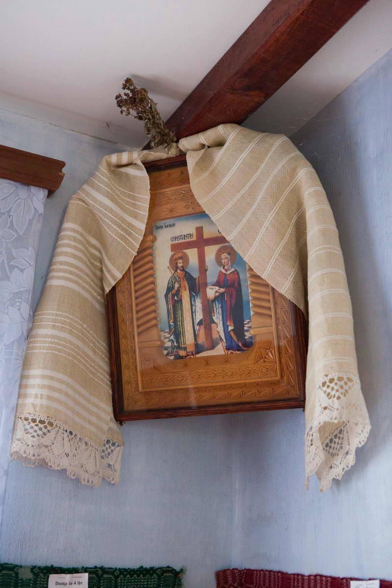 Câteva sate mai sus de Slobozia Mare, dar tot în Lunca Prutului de Jos, la Pașcani, am întâlnit și cazuri când ștergarele erau puse la icoane. Imagine din Muzeul Meșteșugurilor Populare din Pașcani, în prezent desființat. Muzeul era administrat de meșteșugarul Constantin Olteanu. Fotografie de Roman Friptuleac.