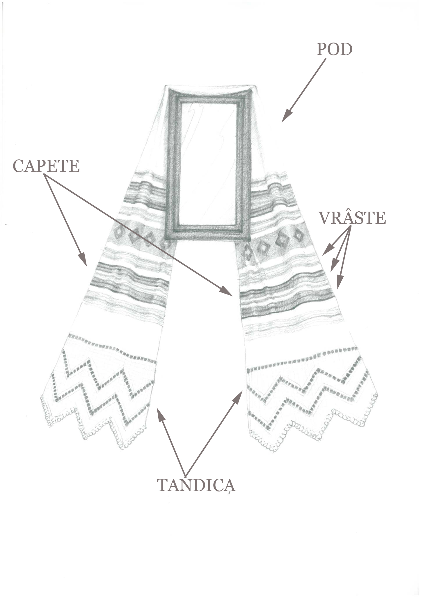 Părțile ștergarului. Desen realizat pentru proiectul nostru de Ristea Andrei, pe baza ștergarului de la oglindă din casa doamnei Catița Pană (ștergar ce apare în fotografia anterioară).