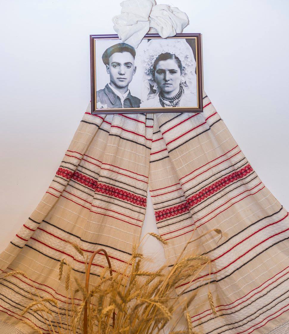 Ștergar pus la rama de fotografie, la Muzeul Pâinii din Văleni. În imaginea din ramă apar Eufrosinia și Nicolae Nastas din Văleni, părinții doamnei Vera Caminschi, cea care administrează Muzeul Pâinii. Fotografie de Victor Pictor.
